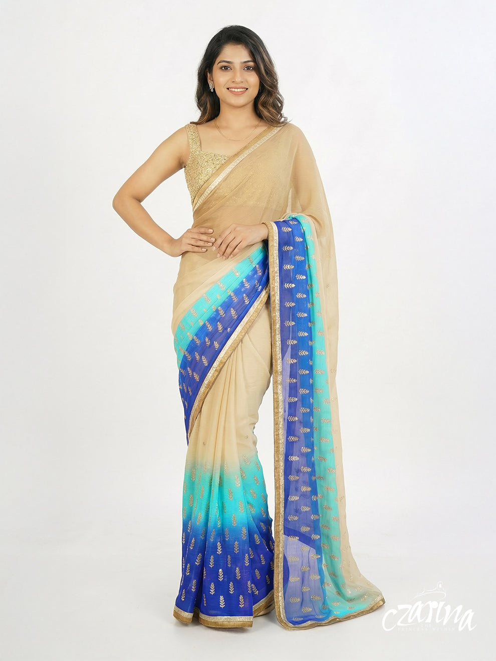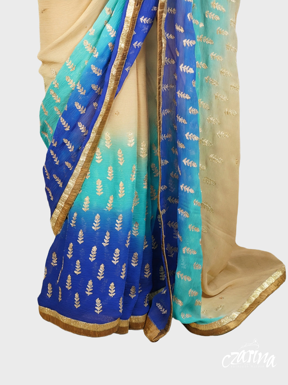 Beige, turquoise, and ink blue shaded georgette saree finished with delicate golden embroidery. Lightweight and fluid, designed to move effortlessly from day gatherings to evening occasions.