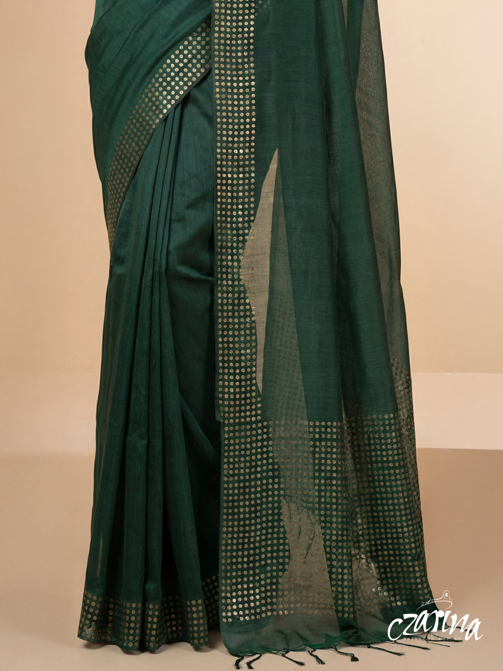 This bottle green bailou saree features embedded sequins across the body, adding a subtle shimmer that enhances the richness of the colour. Lightweight and fluid, it drapes comfortably while offering a refined festive look suitable for evening celebrations and special occasions.