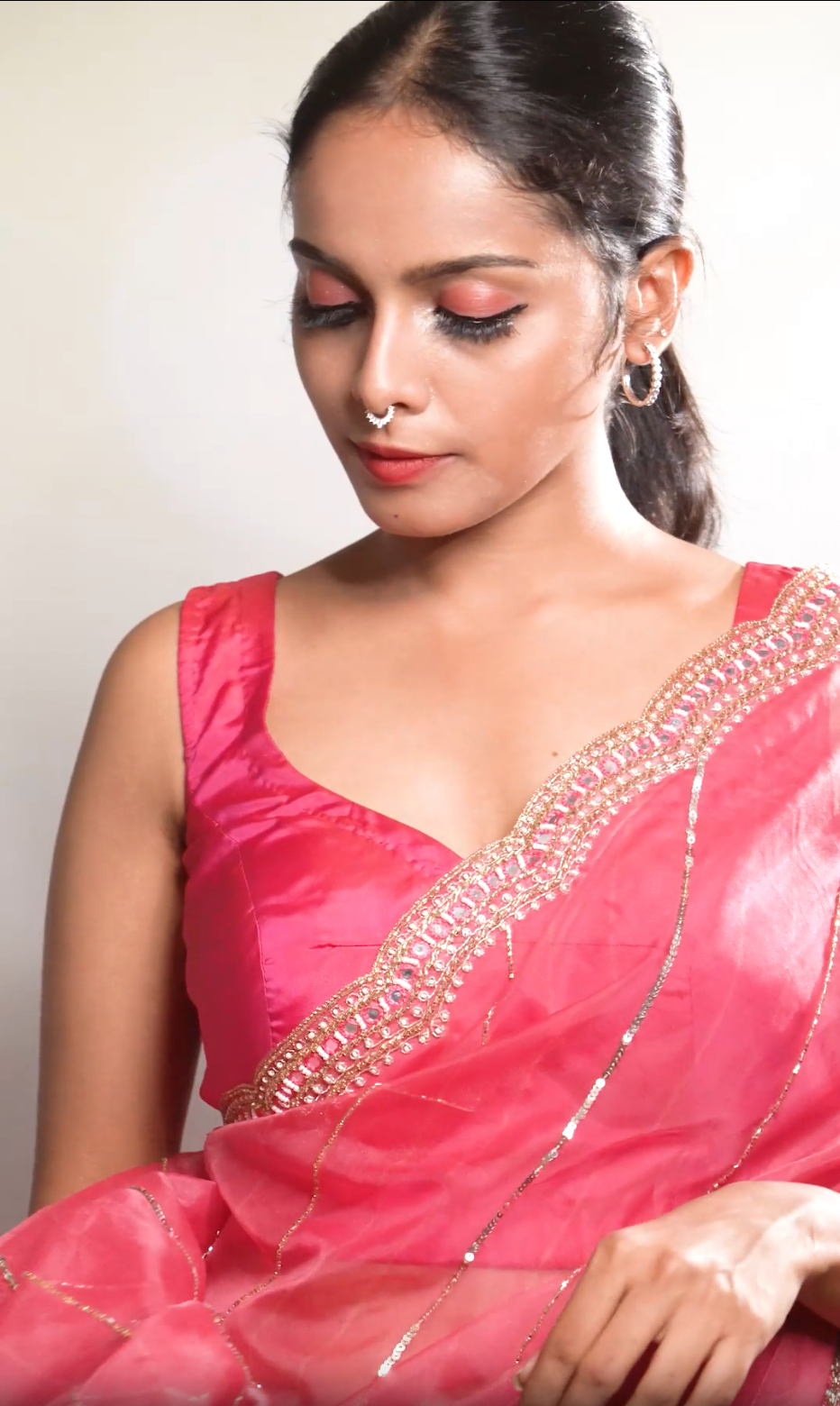 Sheer organza saree in a rich magenta hue with flowing lehariya patterns, highlighted by delicate sequins and mirror embroidery. Light, festive, and designed to stand out.