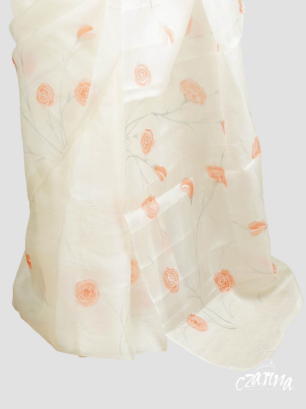 OFF-WHITE SILK ORGANZA SAREE WITH PEACH HAND-PAINTED FLORAL DESIGNS